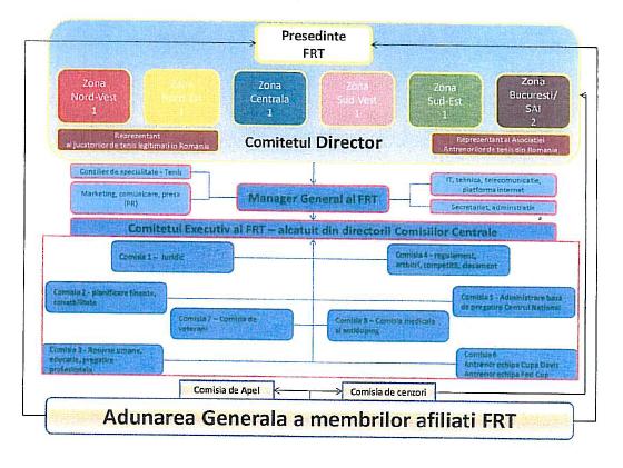 Federatia Romana de Tenis va fi organizata dupa modelul de Organigrama atasat prezentului document (foto 2). Vor exista comisii si resorturi care vor asigura functionalitatea FRT; structura acestora, cat si atributiile si activitatile lor fiind transparente, pot fi cunoscute de catre orice persoana interesata.
