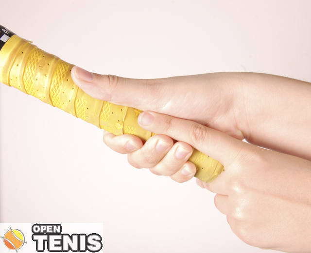 Cea mai simpla metoda este sa luati racheta cu o prize de forehand. Marimea manerului este ideala daca introducand degetul aratator de la cealalta mana, acesta va atinge intr-o parte podul palmei si in cealalta parte va atinge varful degetelor mainii care tine racheta (imaginea 2).