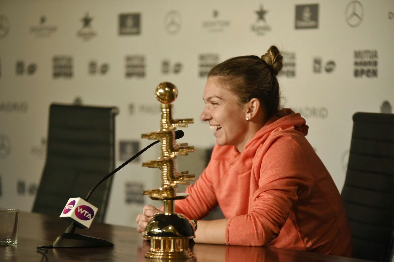 La final, cele două jucătoare s-au felicitat reciproc, românca transmițându-i franțuzoaicei că-i urează să ajungă printre cele mai bune zece jucătoare din lume. ”Mulțumesc foarte mult. Trofeul este foarte greu, dar e prea frumos ca să-l las din mână. Felicitări și Kristinei. Îți doresc să ajungi în Top 10 în acest an. Suntem doar la începutul sezonului și ai jucat foarte bine până acum. Țin să le mulțumesc și sponsorilor, mă simt foarte norocoasă că am reușit să câștig două titluri la rând. De asemenea, am mai jucat aici o finală, deci Madridul este un loc foarte special pentru mine”, a declarat Simona Halep, după ce a primit trofeul de la fostul mare jucător spaniol Manolo Santana. ”Vă mulțumesc vouă pentru că mă faceți să mă simt ca acasă. Mulțumesc echipei mele. Darren (Cahill), tatălui meu, care e cam nervos în timpul meciurilor, dar mă bucur că ai venit. Vă mulțumesc și vouă, românilor din tribună care m-ați susținut mereu. Multumesc și lui Ion Țiriac pentru că e alături de mine, chiar și în momentele grele”, a mai spus Halep. Pe final de discurs, românca a declarat zâmbind că deja aşteaptă să revină la turneul care i-a adus cele mai mari realizări în carieră.”Abia aştept să mă întorc aici anul viitor”. Într-o dispoziţie excelentă, ea a făcut glume cu ziariştii la conferinţa de presă: “Haideţi, băieţi, mă aşteaptă un chocolate mousse”.