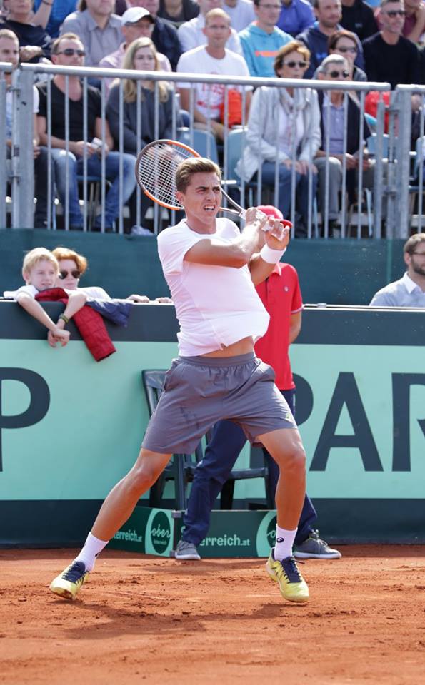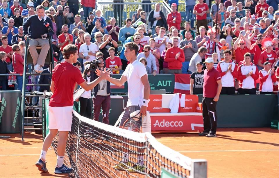 În al doilea meci de simplu, diferenţa de valoare a fost şi mai mare, în condiţiile în care prima rachetă a austriecilor, Dominic Thiem, este pe locul 7 mondial. Acesta s-a impus cu 6-2, 6-2, 6-4 într-o oră şi 56 de minute. În vârstă de 20 de ani şi 5 luni şi cu un singur meci jucat în circuitul ATP (anul trecut, în primul tur preliminar la turneul de la Bucureşti), Bogdan a avut destule momente în care i-a dat emoţii lui Dominic. În primele două seturi s-au consemnat destule game-uri care puteau fi adjudecate de român şi numai experienţa a făcut ca diferenţa de scor să fie atât de mare. În setul al treilea, românul a realizat un break alb la 2-5, a salvat minge de meci în game-ul următor, după care a avut o ocazie să egaleze la 5, dar până la urmă Thiem şi-a adjudecat setul cu 6-4.