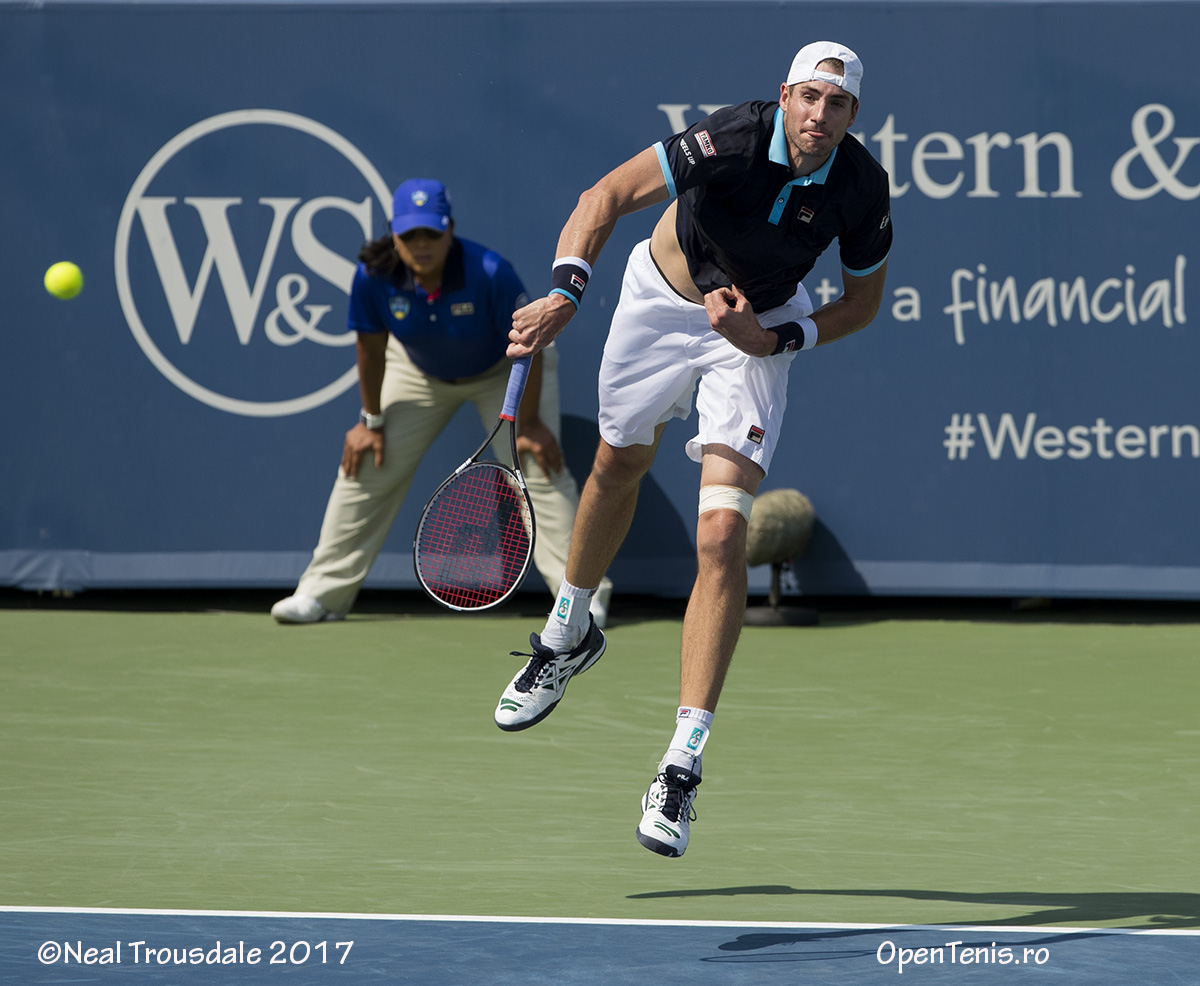 Dimitrov s-a calificat prima oară în carieră în finala unui Masters 1.000 ATP, după ce l-a învins în două seturi terminate cu tie-break, 7-6 (4), 7-6 (10), pe americanul John Isner (19 ATP, cs 14). Niciunul dintre jucători nu a câştigat vreun game pe serviciul adversarului, cu menţiunea că Isner a ratat două mingi de break în primul set la 3-2, iar Dimitrov una în partea a doua a confruntării, la 5-4, fiind vorba, implicit, de minge de meci. În al doilea tie-break, Isner a avut trei ocazii de a duce meciul în decisiv, iar Dimitrov a mai ratat două mingi de meci până să obţină calificarea.