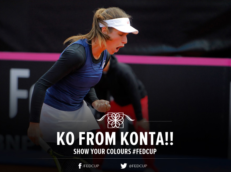 Partida a fost marcată de incidentele care au avut loc pe parcursul celui de-al doilea set. La scorul de 2-1 pentru Sorana, Ilie Năstase, căpitanul nejucător al României, a avut o discuție cu arbitrul de scaun, a intervenit arbitrul oficial, iar Năstase a fost trimis în tribună, pentru ca apoi să fie evacuat din incinta terenului. Locul său pe bancă a fost luat de jucătoarea Monica Niculescu. Cîrstea a reușit un break și s-a desprins la 3-1, dar meciul a fost întrerupt din nou de arbitrul elvețian. Konta, hărțuită verbal din tribună, a izbucnit în lacrimi și a fost nevoie ca Simona Halep să facă un apel la spectatori pentru a păstra decența în timpul meciului. Crainicul a făcut un nou apel spectatorilor, avertizându-i că echipa României poate fi descalificată. Cîrstea și Konta au reluat jocul după trei minute de încălzire.