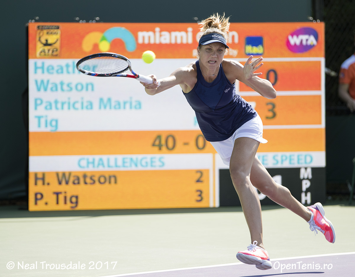 Jucătoarea română Patricia Maria Ţig (95 WTA, venită din calificări) a trecut de primul tur la Miami Open (6.993.450 de dolari), turneu care se desfăşoară în complexul sportiv Tennis Center at Crandon Park. Românca a învins-o, într-un preambul al meciului de Fed Cup din 22 şi 23 aprilie de la Mamaia, pe britanica Heather Watson (108 WTA) cu 7-6 (4), 6-1, la capătul unui meci care a durat o oră şi 26 de minute. Primul set a fost unul echilibrat, cu mai multe întoarceri de scor. Patricia a intrat mai greu în meci, văzându-se condusă cu 2-0 şi 3-2, dar în acel moment a apăsat acceleraţia şi a câştigat trei game-uri la rând, pe parcursul cărora a cedat doar cinci puncte. A servit pentru a pune capăt setului, dar presiunea momentului şi-a spus cuvântul, Watson convertind în punct a patra minge de break. În următoarele două game-uri fiecare jucătoare şi-a ţinut serviciul, astfel că s-a ajuns la tie-break. Până la 3-3 s-a mers cap la cap, după care Ţig a mărit puţin viteza de joc, lucru care a nemulţumit-o pe adversară, aceasta câştigând un singur punct din următoarele cinci jucate.