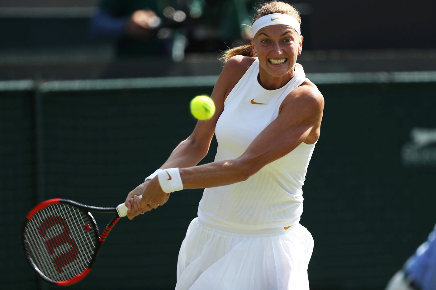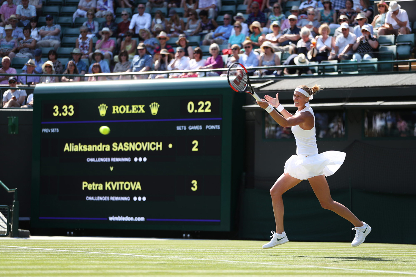 Jucătoarea cehă, câştigătoare la Wimbledon în 2011 şi 2014, a fost eliminată de belarusa Aliaksandra Sasnovich (50 WTA) cu 6-4, 4-6, 6-0. Înainte de turneul de la All England Club, specialiştii o cotau pe Petra drept principala favorită la trofeu, iar jurnaliştii de la Tennis Magazine o vedeau în semifinale, alături de Angelique Kerber, Venus Williams și Serena Williams. Cu probleme fizice, după ce săptămâna trecută, la Eastbourne, s-a retras, Kvitová spera să se recupereze total până la al treilea turneu de Grand Slam. Nu a fost aşa, ea ţinându-se în mai multe rânduri de coapsă, zona în care a avut probleme săptămâna trecută. Halep urma să o întâlnească pe cehoaică în sferturi. Petra este poate cea mai în formă jucătoare din acest sezon, la Birmingham, pe iarbă, cucerind al 5-lea trofeu din 2018 şi al 25-lea din întreaga carieră.